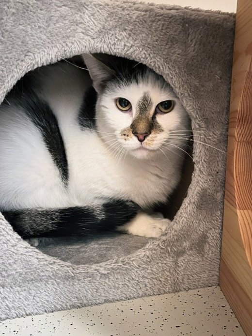 Vlekje is een nieuwsgierige en speelse kat, hij heeft iemand nodig die geregeld tijd kan maken voor actieve speelmomentjes.