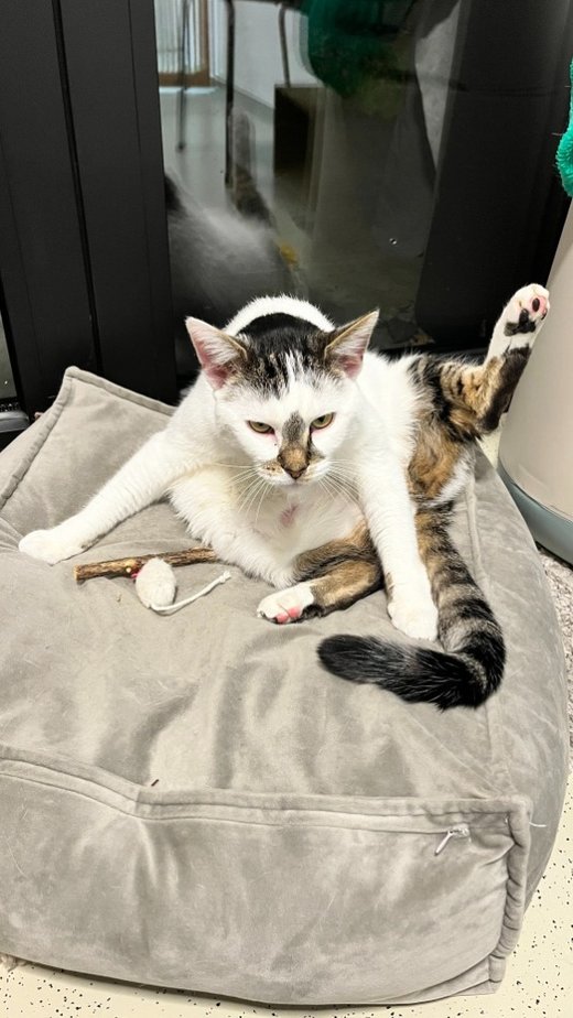Vlekje werd in juni 2023 geboren bij iemand in de tuin. Hij werd daar direct met open armen ontvangen, kreeg eten en mocht binnen in huis. Hij werd ook reeds op jonge leeftijd gevaccineerd en gecastreerd. Hij mocht gaan en staan waar hij wilde en verkoos vooral de tuin om in te vertoeven. Helaas moesten zijn baasjes onlangs verhuizen naar een appartement en omdat Vlekje zo gewoon was van veel buiten te zijn hebben ze besloten om hem af te staan aan het asiel, in de hoop dat ze daar een nieuwe thuis met tuin konden vinden voor hem. Maar Vlekje voelde zich helemaal niet veilig in het asiel en liet dit ook duidelijk blijken, hij liet niemand dichter komen en deed je dat wel dan had je het geweten, want dan haalde hij uit met poot en klauwen. Samen met ons werd er dan beslist om Vlekje naar hier te brengen, we stonden voor een grote uitdaging dachten we ;-) Maar niets was minder waar, na 7 dagen voelde Vlekje zich helemaal thuis en sindsdien is hij de grootste vocale knuffelbeer die we hier ooit in huis hebben gehad.